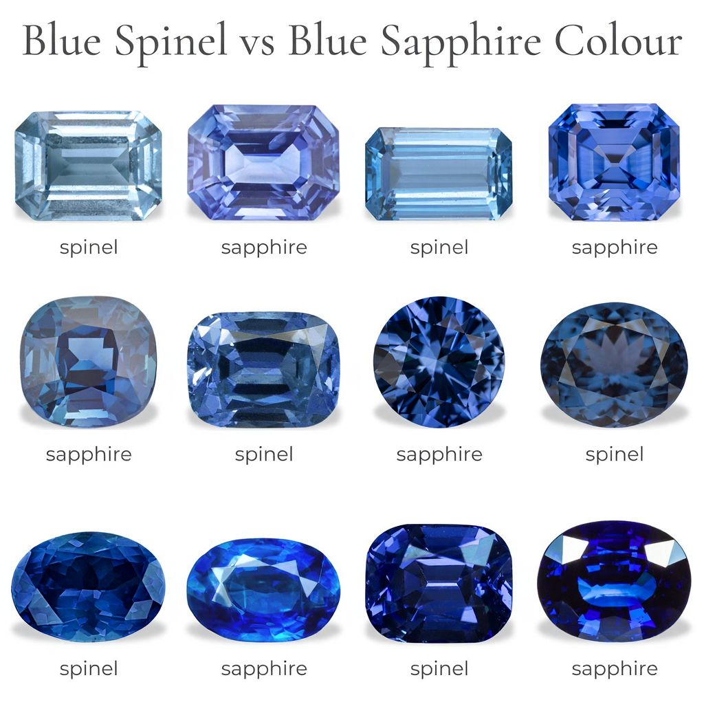 • اسپینل: آبی طبیعی‌تر، کمی خاکستری‌تر، درخشش ملایم‌تر.